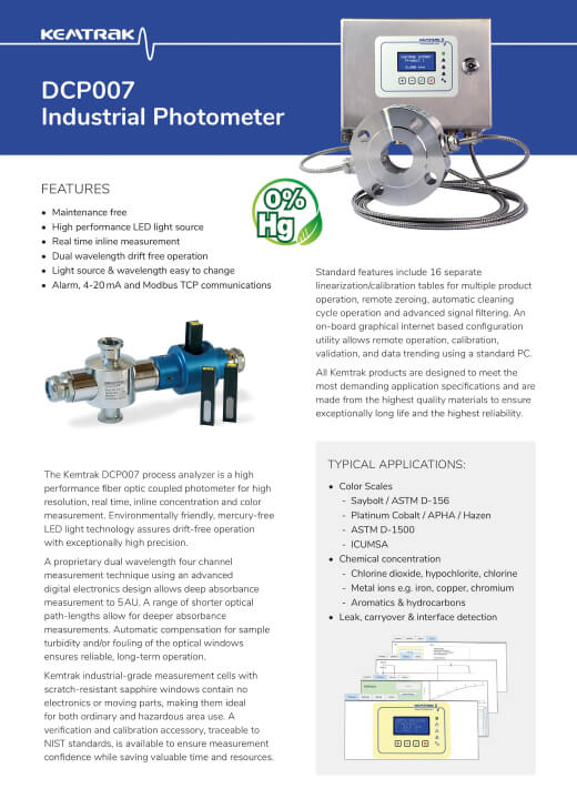 Kemtrak DCP007 використовує довговічне високопродуктивне світлодіодне джерело світла з надійною волоконною оптикою промислового класу для забезпечення високоточних вимірювань без дрейфу та шуму. Запатентована двохвильова, чотириканальна техніка вимірювання, та вдосконалена цифрова електроніка дозволяють проводити глибокі вимірювання абсорбції до 5 AU (1 см OPL). Діапазон коротших оптичних шляхів дозволяє проводити глибші вимірювання абсорбції. Автоматична компенсація каламутності зразка та/або забруднення оптичних вікон забезпечує безпроблемну роботу. Вимірювальні комірки з сапфіровими вікнами, що не потребують обслуговування, не мають електроніки чи рухомих частин, що робить пристрій придатним для використання у вибухонебезпечних зонах.