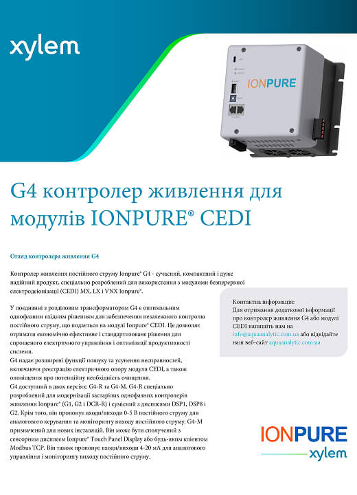 У поєднанні з розділовим трансформатором G4 є оптимальним однофазним вхідним рішенням для забезпечення незалежного контролю постійного струму, що подається на модулі Ionpure CEDI. Це дозволяє отримати економічно ефективне і стандартизоване рішення для спрощеного електричного управління і оптимізації продуктивності системи.