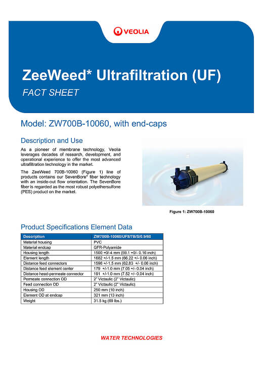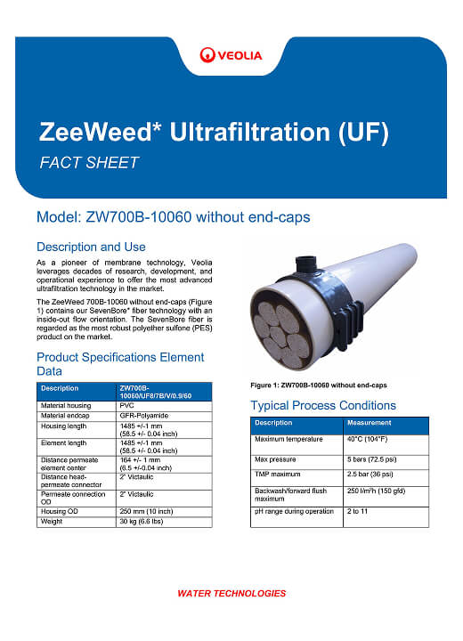 Мембрани ZeeWeed 700B UF, з внутрішньою порожнистою конструкцією Sevenbore від Veolia, відрізняються високою продуктивністю. Ця міцна конструкція ідеально підходить для попередньої обробки мембран зворотного осмосу (RO) та нанофільтрації (NF) у комунальних та нафтогазових застосуваннях, що робить її вибором для багатьох найбільших очисних споруд у світі.