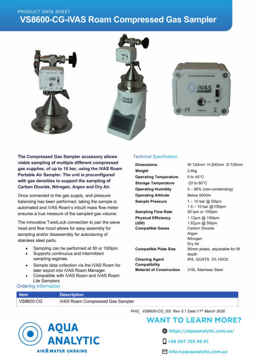 Пристрій дозволяє здійснювати відбір проб різних типів стисненого газу, під тиском до 10 бар, за допомогою портативного пробовідбірника повітря iVAS Roam. Пробовідбірник попередньо налаштовується на необхідну щільність газу, для підтримки відбору проб Вуглекислого газу, Азоту, Аргону та Сухого повітря.
