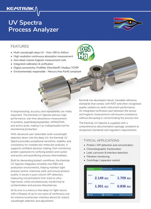 У біопроцесах точність і відтворюваність є життєво важливими. Kemtrak UV Spectra забезпечує високопродуктивні вимірювання абсорбції білків, пептидів, мРНК/ДНК та амінокислот у режимі реального часу, що робить його критично важливим інструментом для сучасного біохімічного виробництва.